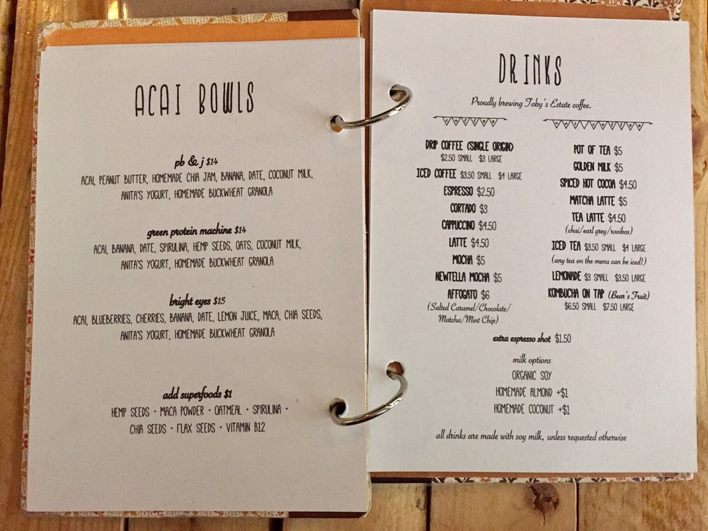 Acai, peanut butter, homemade chia jam, banana, date, homemade almond & coconut milk, coconut clotted cream, and homemade buckwheat granola.